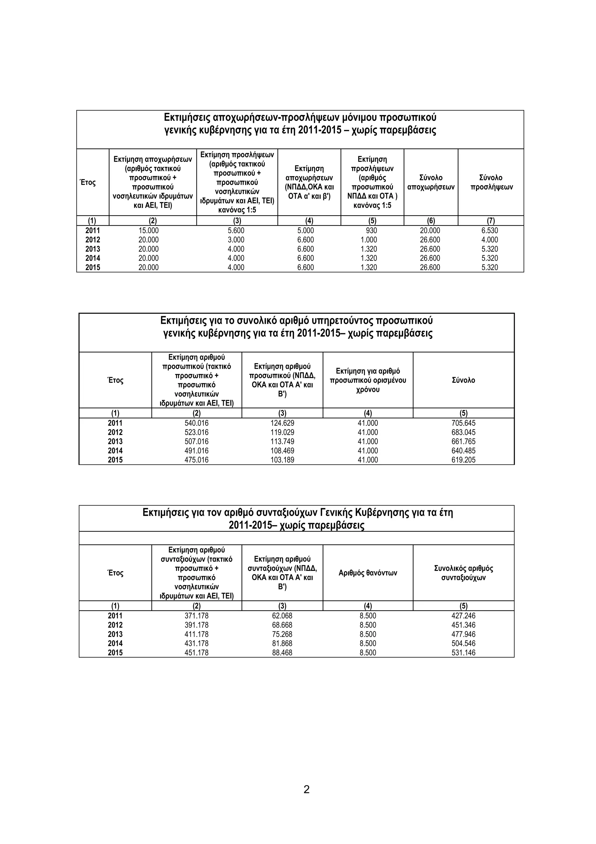προσωπικού γενικής κυβέρνησης για τα έτη 2011-2015 – χωρίς παρεµβάσεις Εκτίµηση προσλήψεων Εκτίµηση αποχωρήσεων Εκτίµηση (αριθµός τακτικού (αριθµός τακτικού Εκτίµηση προσλήψεων προσωπικού + προσωπικού + αποχωρήσεων (αριθµός Σύνολο Σύνολο Έτος προσωπικού προσωπικού (ΝΠ∆∆,ΟΚΑ και προσωπικού αποχωρήσεων προσλήψεων νοσηλευτικών νοσηλευτικών ιδρυµάτων ΟΤΑ α' και β') ΝΠ∆∆ και ΟΤΑ ) ιδρυµάτων και ΑΕΙ, ΤΕΙ) και ΑΕΙ, ΤΕΙ) κανόνας 1:5 κανόνας 1:5 (1) (2) (3) (4) (5) (6) (7) 2011 15.000 5.600 5.000 930 20.000 6.530 2012 20.000 3.000 6.600 1.000 26.600 4.000 2013 20.000 4.000 6.600 1.320 26.600 5.320 2014 20.000 4.000 6.600 1.320 26.600 5.320 2015 20.000 4.000 6.600 1.320 26.600 5.320 Εκτιµήσεις για το συνολικό αριθµό υπηρετούντος προσωπικού γενικής κυβέρνησης για τα έτη 2011-2015– χωρίς παρεµβάσεις Εκτίµηση αριθµού προσωπικού (τακτικό Εκτίµηση αριθµού Εκτίµηση για αριθµό προσωπικό + προσωπικού (ΝΠ∆∆, Έτος προσωπικού ορισµένου Σύνολο προσωπικό ΟΚΑ και ΟΤΑ Α' και χρόνου νοσηλευτικών Β') ιδρυµάτων και ΑΕΙ, ΤΕΙ) (1) (2) (3) (4) (5) 2011 540.016 124.629 41.000 705.645 2012 523.016 119.029 41.000 683.045 2013 507.016 113.749 41.000 661.765 2014 491.016 108.469 41.000 640.485 2015 475.016 103.189 41.000 619.205 Εκτιµήσεις για τον αριθµό συνταξιούχων Γενικής Κυβέρνησης για τα έτη 2011-2015– χωρίς παρεµβάσεις Εκτίµηση αριθµού συνταξιούχων (τακτικό Εκτίµηση αριθµού προσωπικό + συνταξιούχων (ΝΠ∆∆, Συνολικός αριθµός Έτος Αριθµός θανόντων προσωπικό ΟΚΑ και ΟΤΑ Α' και συνταξιούχων νοσηλευτικών Β') ιδρυµάτων και ΑΕΙ, ΤΕΙ) (1) (2) (3) (4) (5) 2011 371.178 62.068 8.500 427.246 2012 391.178 68.668 8.500 451.346 2013 411.178 75.268 8.500 477.946 2014 431.178 81.868 8.500 504.546 2015 451.178 88.468 8.500 531.146 2