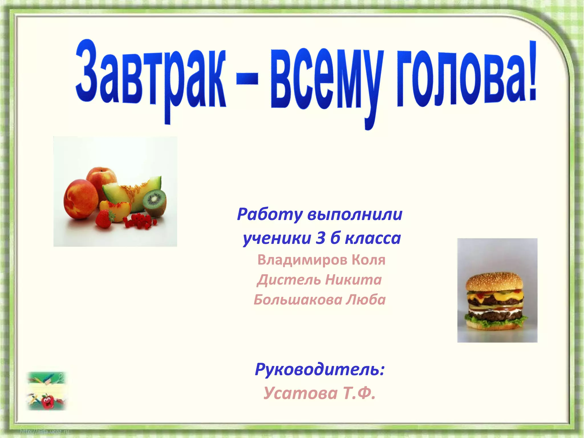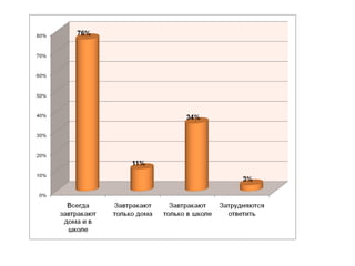 Документ описывает исследование учащихся начальных классов о важности завтрака для здоровья. Исследование включает опросы и анализ питания, в результате которого выявлено, что полноценный завтрак помогает улучшить здоровье детей. Учащиеся пришли к выводам о необходимости завтраков и планируют рекомендовать два завтрака в день, включая горячий.