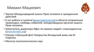 Документ представляет взгляды Михаила Мацкевича на гражданское образование, которое он определяет как ключевой элемент образовательного процесса на протяжении всей жизни. Он подчеркивает необходимость использования прав человека как основы для воспитания демократической гражданственности и важность инклюзивности в образовании. Также обсуждаются патриотическое воспитание и рекомендации по успешным практикам образования в области прав человека.