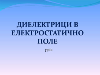 Електростатично поле вприсъствие на диелектрик Във външно електростатично поле диелектрикът се поляризира. Ако два заряда q 1 и q 2 са поставени в диелектрична среда, например вода, в резултат на поляризацията около тях се появяват диполи, които се ориентират така, че компенсират част от зарядите и с това намаляват силите на електростатично взаимодействие.