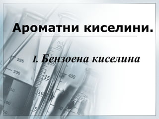 3. Химични свойстваДисоциация: C 6 H 5 COOH = > H + + C 6 H 5 COO - Реакции до карбоксилната група- Взаимодействие с натриева основа : C 6 H 5 COOH + NaOH => C 6 H 5 COONa + H 2 O ( неутрализация ) натриев бензоат Взаимодействие с алкохоли: C 6 H 5 COOH + С 2 Н 5 ОН = > C 6 H 5 COO С 2 Н 5 + H 2 O (естерификация) етилбензоат Реакции до бензеновото ядро Нитриране: