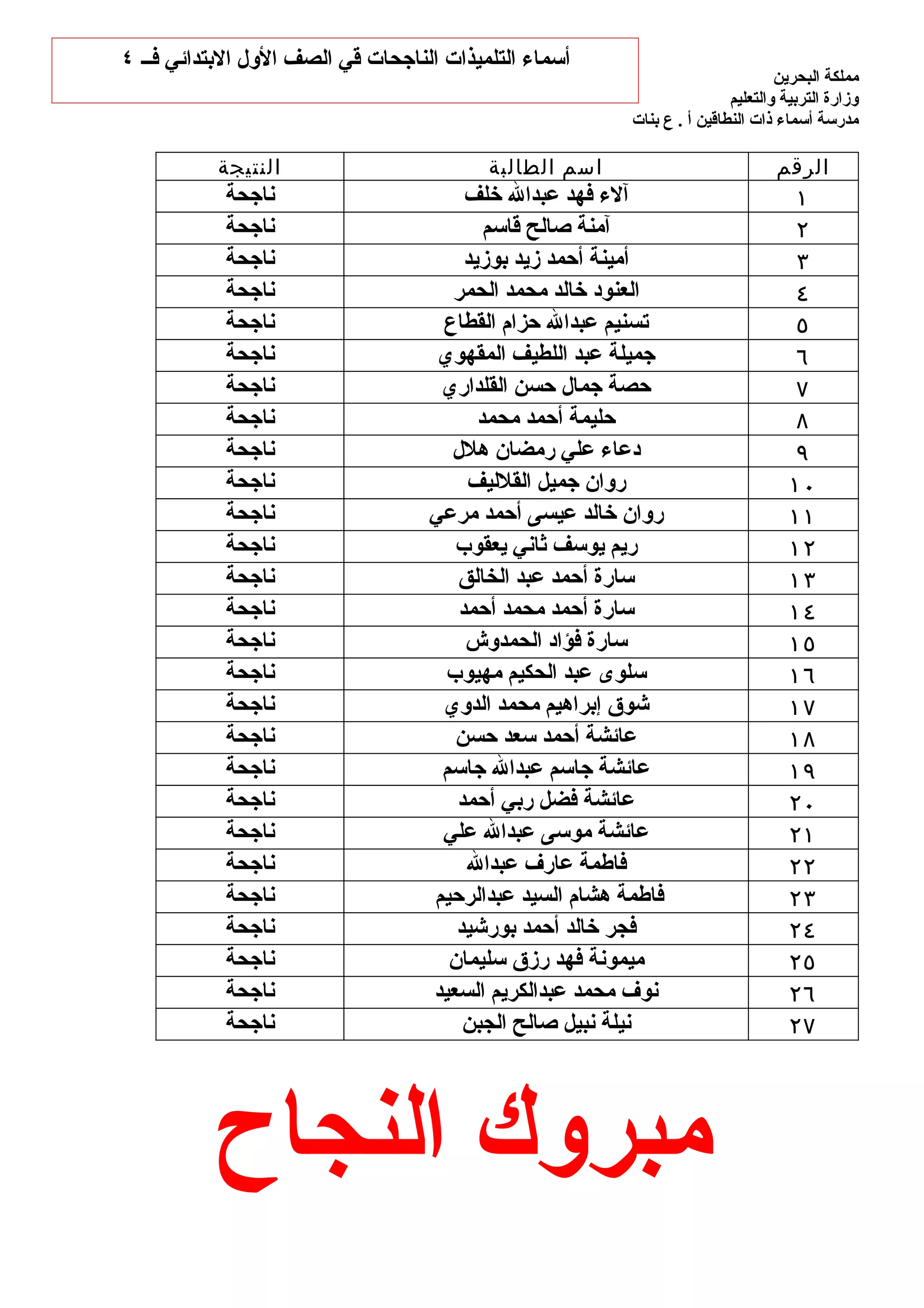 تضم الوثيقة قائمة بأسماء التلميذات الناجحات في الصف الأول الابتدائي في مدرسة أسماء ذات النطاقين للبنات في مملكة البحرين. جميع التلميذات المذكورات حصلن على نتائج ناجحة. الوثيقة تهنئهن بمناسبة النجاح.