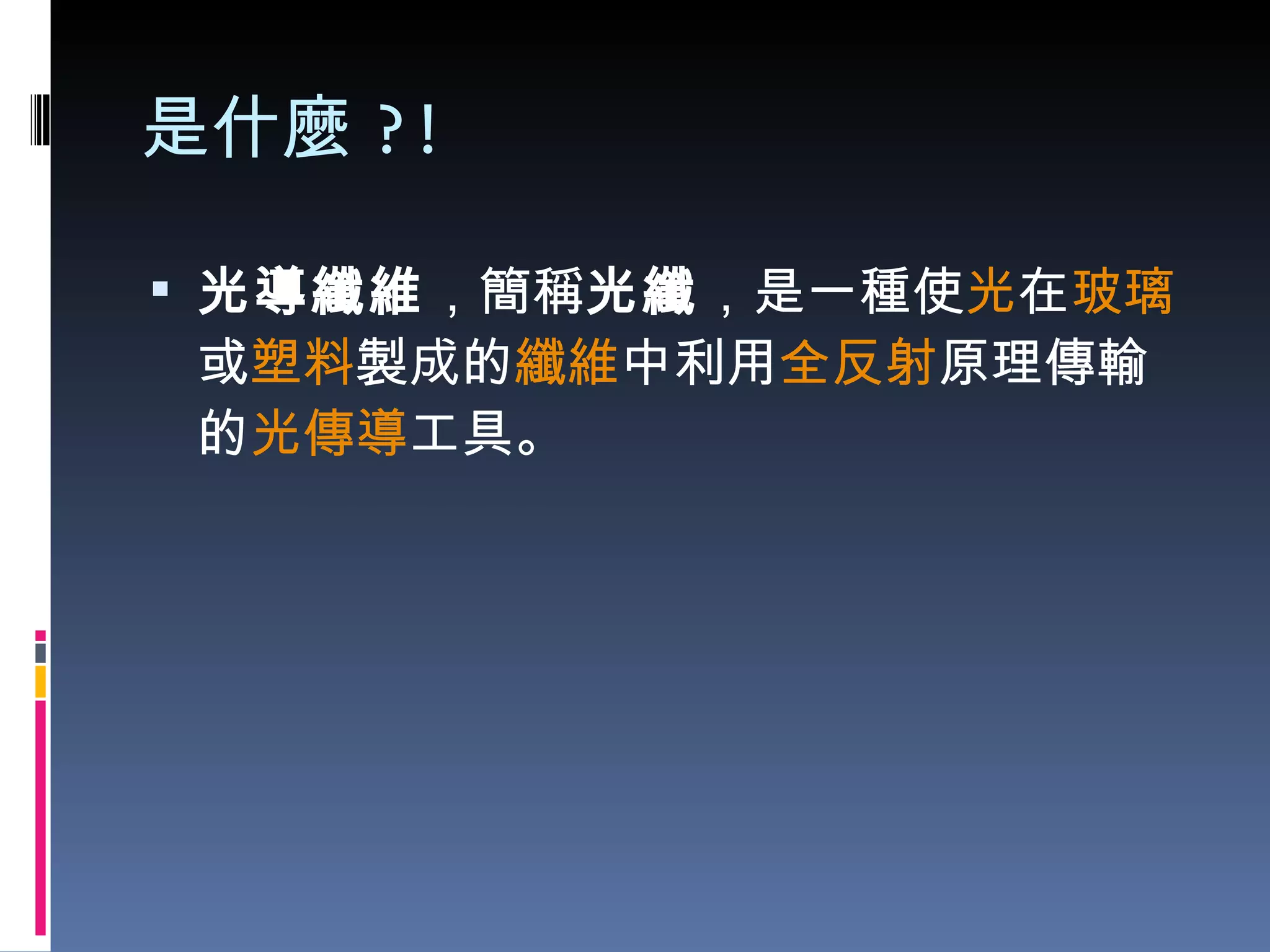 光导纤维是一种通过全反射原理在玻璃或塑料纤维中传输光的工具,主要用于长距离信息传递。光纤分为渐变光纤和突变光纤,以及单模光纤和多模光纤,具有低信号损失和广泛频带宽度的优点。光纤在通信、医学和娱乐等领域有广泛的应用。
