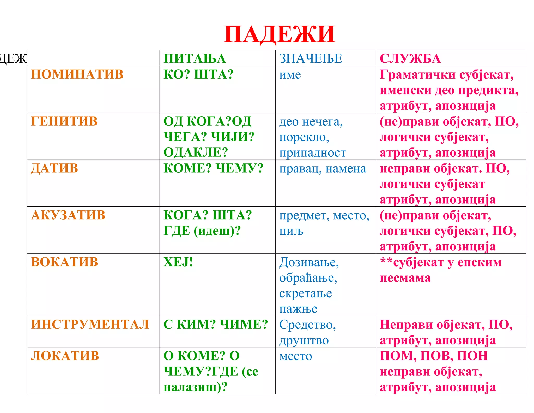 СЛУЖБА НОМИНАТИВ КО? ШТА? име Граматички субјекат, именски део предикта, атрибут, апозиција ГЕНИТИВ ОД КОГА?ОД ЧЕГА? ЧИЈИ? ОДАКЛЕ? део нечега, порекло, припадност (не)прави објекат, ПО, логички субјекат, атрибут, апозиција ДАТИВ КОМЕ? ЧЕМУ? правац, намена неправи објекат. ПО, логички субјекат атрибут, апозиција АКУЗАТИВ КОГА? ШТА? ГДЕ (идеш)? предмет, место, циљ (не)прави објекат, логички субјекат, ПО, атрибут, апозиција ВОКАТИВ ХЕЈ! Дозивање, обраћање, скретање пажње **субјекат у епским песмама ИНСТРУМЕНТАЛ С КИМ? ЧИМЕ? Средство, друштво Неправи објекат, ПО, атрибут, апозиција ЛОКАТИВ О КОМЕ? О ЧЕМУ?ГДЕ (се налазиш)? место ПОМ, ПОВ, ПОН неправи објекат, атрибут, апозиција