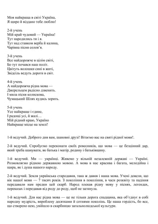 1-й ведучий. Для нас рідна мова — це не тільки дорога спадщина, яка об’єднує в собі