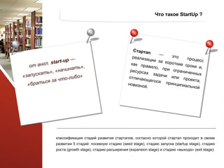 Документ описывает стадии развития стартапов, выделяя пять ключевых этапов: посевную стадию, стадию запуска, стадию роста, стадию расширения и стадию выхода. Он также представляет информацию о проекте 'Висс', который направлен на поддержку инвалидов в Псковской области, обеспечивая доступ к социальной информации и помощи для специалистов и потребителей социальных услуг. В работе рассматриваются инвестиции, структура проекта и методы привлечения пользователей.