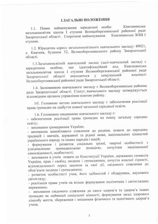 lloeHe HafivrenyeaH:Hfl. ropu4uunoi oco6n: KnqrIaH'f,HClKa 3araJrbHooceirnf, rrrKoJra I cryueHx Benra(o6epesnaHcrrcoi pafionHoi Pap'U 3ar<apnarcrroi o6nacri. Cr<opouene nafivrenyBaHHfl: Kn-f,u4HsHcsra 3OI[ I cTyrleHtr. 1.2. IOpunv]:![HaaApec 3araJlbHooceirHroro HaBr{aJIbHoro 3aKJIaly: 89021' c. KutuaHl, 6yAranor 52, Belraro6epe3HqHcbKoro pafi'ory 3axapnarclroi o6nacri. 1.3.3aran*rooceirHifi nae.{a6Hufi 3aKJIaA (Aani-nae'aantHuiT' 3aKnaA) € ropr4Ar4rrHoro oco6orc, Mae i4eurraQir<aritttuit KoA' Kusruusncrra 3afaJlbHoocsirHs IIIKoJIa I cryneru E enuxo6epe3HflHcbKoi pafiouHoi Pap.u o6nacri 3HaxoAl4rbc-r y KoMyHaJIbHifi BnacHocri flHcbKoipaftoHrroiPanu3arapuarcbKoio6rracri. I.4. 3acnoBHLrKoM HaBrr€urbHoro 3aKrraA] e Benuro6epeeHfHcbKa pafionua pana 3araplarclroi o6lacri. Craryr, HaBqaJIbHoro 3aKJIaAy 3aTBepAxy€rbcfl siruoeiruIl,rM opraHoM yrlpaBrinnq ocniroro pafi ouy' 1:5. fonoBHoro MeToro HaBr{aIbHOro 3aKJIaAy e 3a6e3ne'{eHHt peani:aqii rrpaBa fpoMaAflH ua s4q6yrr.rr IIoBHoi garallHoi cepe4Hloi ocsirz. 1.6. fonoBHnMtr 3aBAaHH.rrMI4 HaBr{aJIbHOfO 3aKJIaAy e: - ga6egner{eHHfl peanisaqii npaea rpoMaAf,H Ha IIoBHy 3araJlbHy cepeAHlo ocniry; - BrrxoBaHH{ I-poM a1fl:nr4:na Yr<paiHra; - Br{xoBaHH_tr Urano6nraBofo craBleHHq Ao poAI4HI4, tIoBafI4 AO HapoAHI4X rpa4uqifi i seu.Iais, AeplKaBuoi ra pi4noi MSBI4' HarlionalbHl4x Ilinnocrefi yxpaincrKoro HapoAy ra inruzx uapo4in i nauifil - QopruryBaHHr i poterzror coqian"no spinoi, rnopuoi oco6ucrocri 3 ycei4ovueHoro rpoMaAflHcbKolo noguqieio, [oqyTTsM nauionalruoi cauocei4otuocri, oco6ncrocri ; - Br4xoBaHH.s B yunie IIoBaII4 4o Koncrr'rryUii YxpaiHu, AepXaBHI4X cI'lMBoJIlB Yr<painra, 11paB i ceo6oA nroAr4HI4 i rpoua4fl-lvI1A, [Or{yrTq elacHoi riAuocri' eiauoniAangrocri nepeA 3aKOHOM 3a ceoi Aii, cni4ouoro cTaBJIeHH'g Ao o6oe' qgxiB JIToAI4HI4 i rpovra4rnnHa; - po3BI4roK oco6ucrocri yrlHfl' fioro :4i6uocrefi i oSaapyBaHb' HayKoBoro cBlTofnflAy; - peanisaqix upaea yvnie Ha eiDHe $oprlynaHnq noIiTHrIHI4X I CBITOfJIfl'I.HVrx rrepeKoHaHb; - BI{xoBaHHf, cei4otr,loro craBJIeHH-f, Ao cBoro 3AopoB 'fl Ta s4opon'x inurux rpoMaArH sK Hafteurqoi coqia6uoi qinuocri, soptltyeaHgf, 3acaA 3AopoBofo cuoco6y )KI,ITTq, :6epexeHur i guiUHeHHq Qi:rzunoro ra Ilcl4xiqnoro s'4opon'r vqHie: