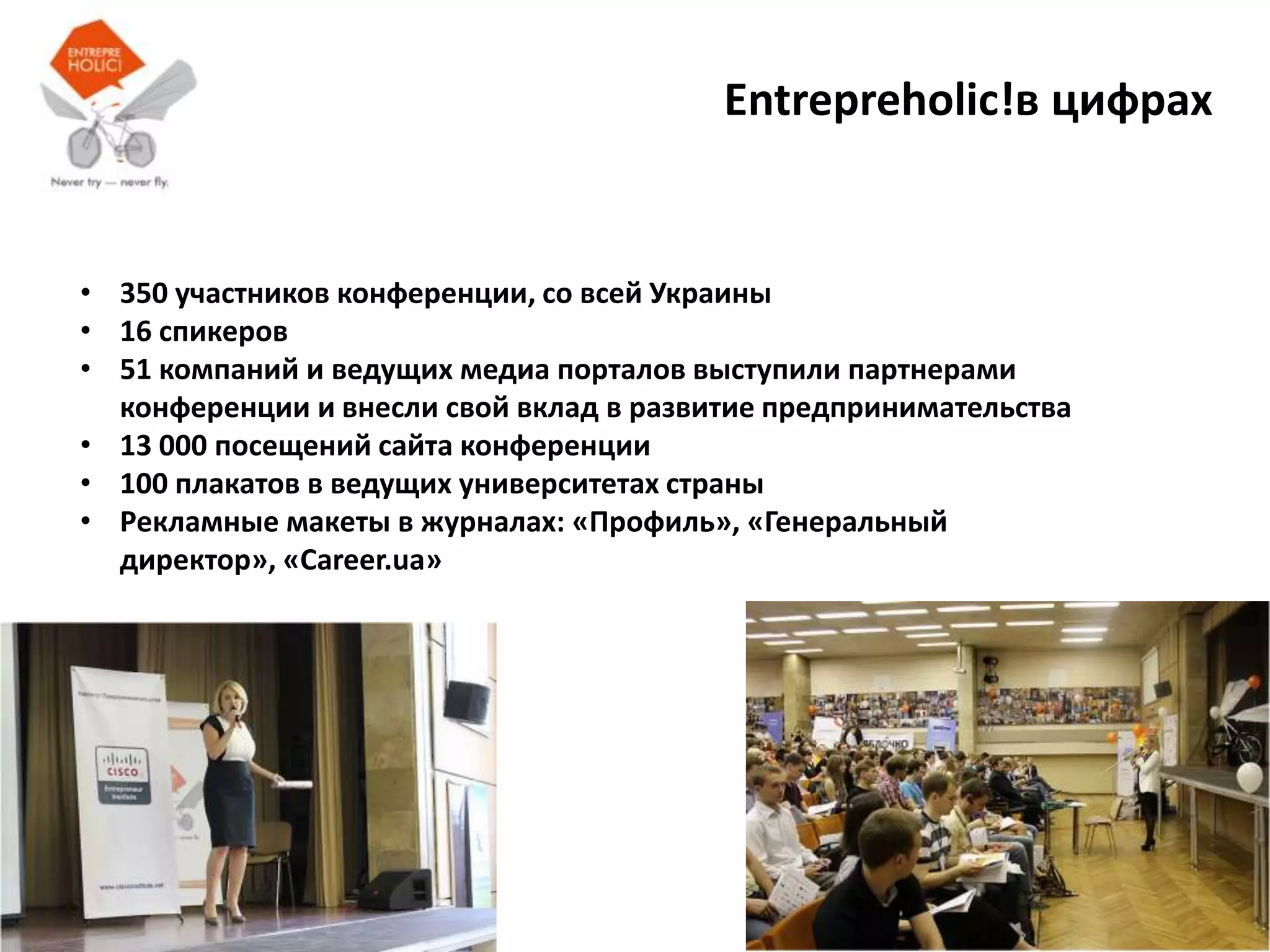 Всеукраинская конференция по предпринимательству entrepreholic! состоялась 21 мая 2011 года, собрав 350 участников и 16 спикеров из всей Украины. Конференция привлекла внимание через 51 компанию и медиа-партнеров, получив более 13 000 посещений сайта и обширное медиа-покрытие. Мероприятие также освещалось в Twitter и имело более 600 просмотров выступлений на сайте.