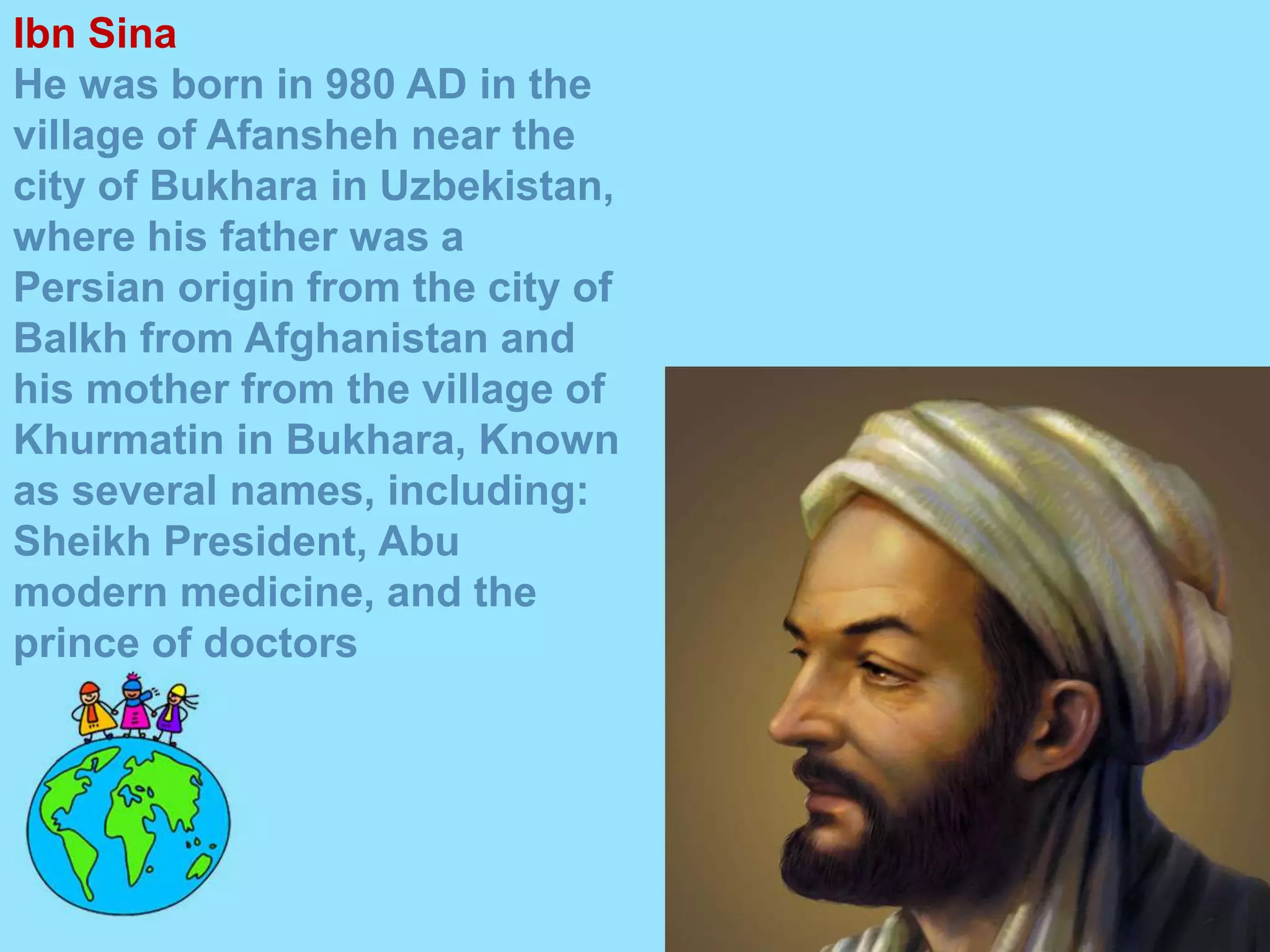 Ibn Sina was a famous Persian polymath born in 980 AD in Uzbekistan. He studied logic, mathematics, and medicine on his own and became a renowned physician, scholar, and philosopher. He wrote several influential medical texts that synthesized Greek and Roman medicine with Islamic traditions. Ibn Sina died in 1037 in Iran at the age of 58 after falling ill in Isfahan and attempting to cure himself with an overdose of medicines.