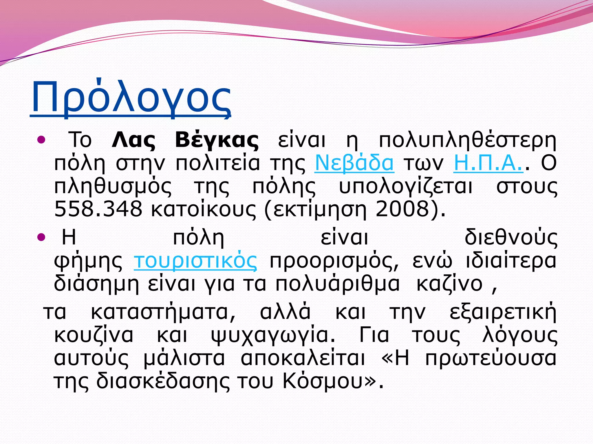 ΠρόλογοςTo Λας Βέγκας είναι ηπολυπληθέστερη πόλη στην πολιτεία της Νεβάδα των Η.Π.Α.. O πληθυσμός της πόλης υπολογίζεται στους 558.348 κατοίκους (εκτίμηση 2008). Η πόλη είναι διεθνούςφήμης τουριστικός προορισμός, ενώ ιδιαίτερα διάσημη είναι για τα πολυάριθμα καζίνο , τα καταστήματα, αλλά και την εξαιρετική κουζίνα και ψυχαγωγία. Για τους λόγους αυτούς μάλιστα αποκαλείται «Η πρωτεύουσα της διασκέδασης του Κόσμου».