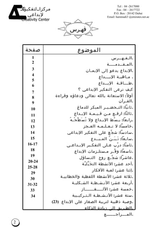 تتناول الوثيقة مفهوم الإبداع وطرق رعايته وتعزيزه لدى الأفراد وخاصة الأطفال، من خلال دعاوى إيمانية وتحضيرات ذهنية وأنشطة متنوعة. تقدم الوثيقة نصائح عملية حول كيفية تعليم التفكير الإبداعي وتشجيع روح التساؤل والخيال. تركز على أهمية دعم الأطفال في بيئة تعليمية مناسبة تعزز الإبداع وتنمي المهارات الفكرية.
