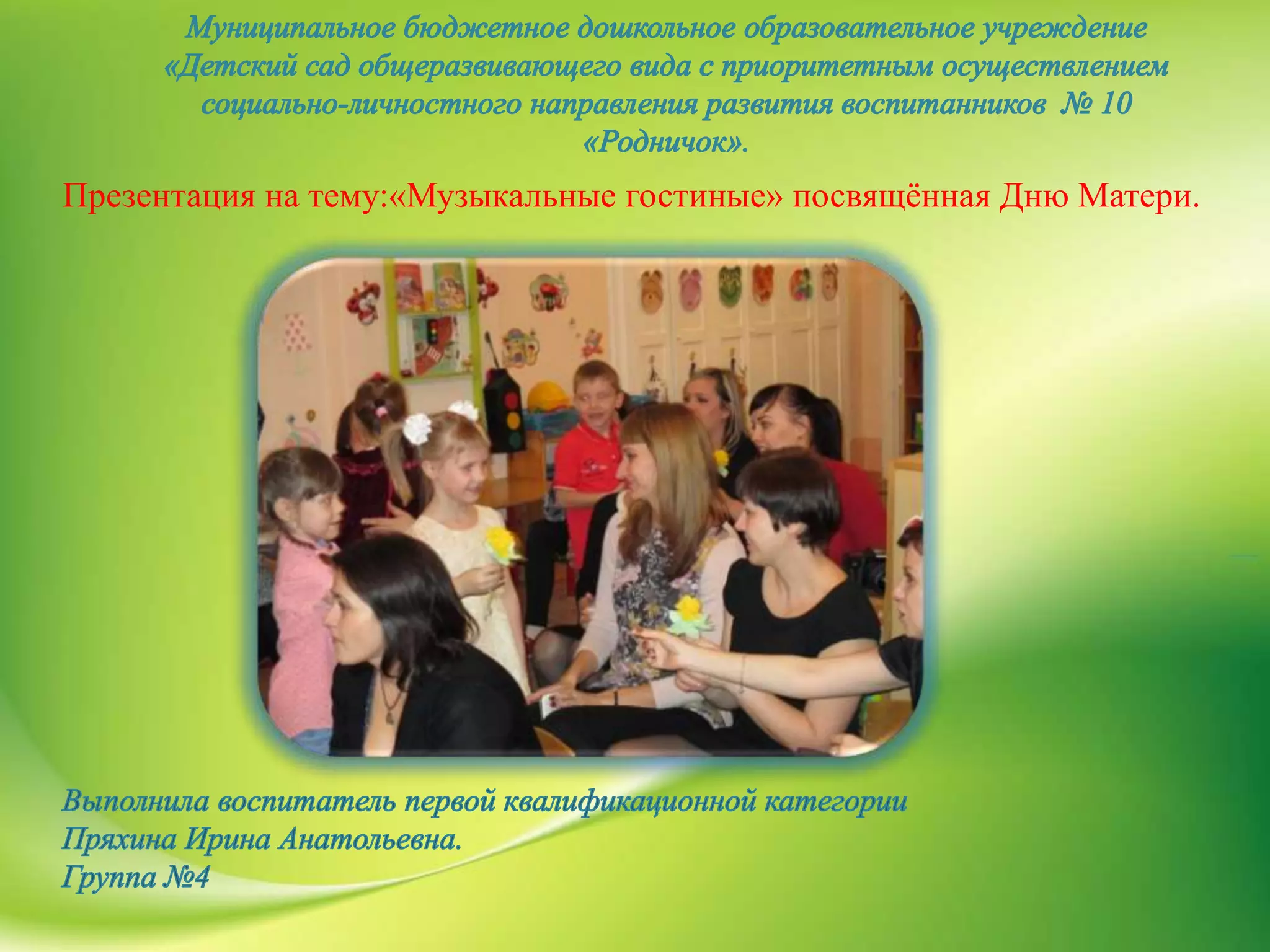 Презентация на тему «музыкальные гостиные» посвящена дню матери и направлена на создание положительных эмоций у детей и родителей. Основные задачи включают обучение выразительному исполнению песни, развитие интереса к традициям и воспитание уважительного отношения к матерям. Мероприятие побуждает активное участие детей и родителей.