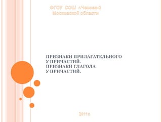 Документ описывает признаки прилагательных и глаголов у причастий, а также содержит задания на их определение и выделение суффиксов. Представлены примеры использования причастий и прилагательных в предложениях, а также морфологические признаки этих частей речи. Задания направлены на практическое закрепление знаний о причастиях и их согласовании в роде, числе и падеже.