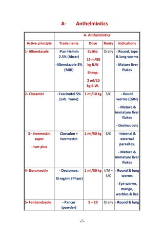 This document provides information on various veterinary drugs used to treat infectious diseases in animals. It is divided into sections on anthelmintics, antibiotics, anti-inflammatory drugs, drugs for blood parasites, and includes the active ingredient, trade name, dose, route of administration, and indications for each drug. The document serves as a guide for veterinarians on appropriate treatment protocols for various parasitic and bacterial infections commonly affecting livestock.
