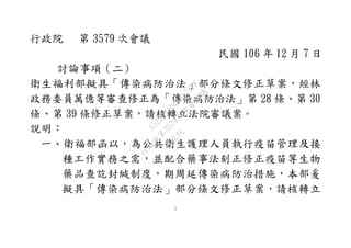行政院第3579次會議討論了衛生福利部擬具的《傳染病防治法》部分條文修正草案,經多部門審查修正,主要針對公共衛生護理人員的預防接種業務及疫苗管理進行調整。此外,修正草案也針對藥事法的相關規範作出配合性修訂,以強化傳染病防治措施。此次修正內容包括增訂護理人員業務範圍及健全相關法規用詞,以促進公共衛生效率。