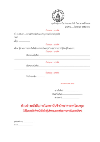 0 2441 1013 เว้นระยะ 1 บรรทัด ที่ อว 78.221..../(กรณีเป็นหนังสือจากตัวบุคคลไม่ต้องระบุเลขที่) วันที่ …………………….. เรื่อง .......................... เว้นระยะ 1 บรรทัด เรียน ผู้อานวยการสถาบันชีววิทยาศาสตร์โมเลกุล/รองผู้อานวยการ/ผู้ช่วยผู้อานวยการ เว้นระยะ 1 บรรทัด (ข้อความหนังสือ)....................................................................................................................... …………………………………………………………………………………………………………………………………………………………… เว้นระยะ 1 บรรทัด (ข้อความหนังสือ)....................................................................................................................... …………………………………………………………………………………………………………………………………………………………… เว้นระยะ 1 บรรทัด จึงเรียนมาเพื่อ.................... ตามความเหมาะสม (ลายมือชื่อ)....................................... (พิมพ์ชื่อเต็ม)................................................ (ตาแหน่ง)......................................... ตัวอย่างหนังสือภายในสถาบันชีววิทยาศาสตร์โมเลกุล (ใช้ในการจัดทาหนังสือถึงผู้บริหารและหน่วยงานภายในสถาบันฯ) ผู้ประสานงาน........................... E-mail......................................