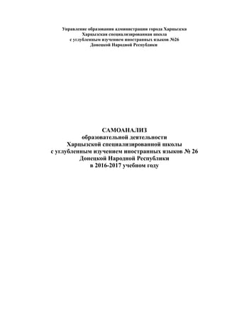 Документ представляет собой самоанализ образовательной деятельности Харцызской специализированной школы с углубленным изучением иностранных языков № 26 за 2016-2017 учебный год, в котором рассматриваются достижения и перспективы развития учебного заведения. Школа обеспечивает углубленное изучение иностранных языков и внедрение новых педагогических технологий, располагает стабильным кадровым составом, высоким уровнем квалификации учителей, несмотря на их возрастное распределение. Основное внимание уделяется повышению качества педагогической деятельности и аттестации педагогов в соответствии с нормативными требованиями.