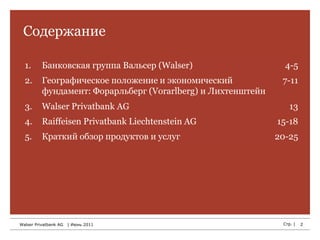 Документ представляет собой отчет о банковской группе Walser, включая ее акционеров, географическое положение и экономический фундамент региона Форарльберг и Лихтенштейн, а также информацию о Walser Privatbank AG и Raiffeisen Privatbank Liechtenstein AG. В отчете подчеркиваются уникальные экономические условия Лихтенштейна и предоставляются сведения о продуктах и услугах, предлагаемых обеими банками. Также упоминается высокое качество обслуживания и персонализированный подход к клиентам.