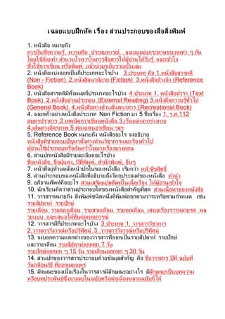 หนังสือ หมายถึง การบันทึกความรู้ ความคิด ประสบการณ์ ลงบนแผ่นกระดาษขนาดเท่า ๆ กัน โดยใช้ถ้อยคา สานวนโวหารในการสื่อสารให้ผู้อ่านได้รับรู้ และเข้าใจ ซึ่งใช้การเขียน หรือพิมพ์ แล้วนามาเย็บรวมเป็นเล่ม 2. หนังสือแบ่งออกเป็นกี่ประเภทอะไรบ้าง 3 ประเภท คือ 1.หนังสือสารคดี (Non - Fiction) 2.หนังสือนวนิยาย (Fiction) 3.หนังสืออ้างอิง (Reference Book) 3. หนังสือสารคดีมีทั้งหมดกี่ประเภทอะไรบ้าง 4 ประเภท 1. หนังสือตารา (Text Book) 2.หนังสืออ่านประกอบ (Externsl Reading) 3.หนังสือความรู้ทั่วไป (General Book) 4.หนังสือทางด้านสันทนาการ (Recreational Book) 4. จงยกตัวอย่างหนังสือประเภท Non Fiction มา 5 ชื่อเรื่อง 1. ร.ศ.112 สมุทรปราการ 2.เทคนิคการเขียนหนังสือ 3.เรื่องเล่าจากร่างกาย 4.เส้นทางอิสรภาพ 5.ท่องแดนอาเซียน ฯลฯ 5. Reference Book หมายถึง หนังสืออะไร จงอธิบาย หนังสือที่ช่วยตอบปัญหาทั้งทางด้านวิชาการและเรื่องทั่วไป ผู้อ่านใช้ประกอบหรือค้นคว้าในบางเรื่องบางตอน 6. ส่วนปกหนังสือมีรายละเอียดอะไรบ้าง ชื่อหนังสือ, ชื่อผู้แต่ง, ปีที่พิมพ์, สานักพิมพ์, อื่นๆ 7. หน้าที่อยู่ด้านหลังหน้าปกในของหนังสือ เรียกว่า หน้าลิขสิทธิ์ 8. ส่วนประกอบของหนังสือที่อธิบายถึงวัตถุประสงค์ของหนังสือ คานา 9. อภิธานศัพท์คืออะไร ส่วนเสริมแปลศัพท์ในเนื้อเรื่อง ให้ผู้อ่านเข้าใจ 10. นักเรียนคิดว่าส่วนประกอบใดของหนังสือสาคัญที่สุด ส่วนเนื้อหาของหนังสือ 11. วารสารหมายถึง สิ่งพิมพ์ชนิดหนึ่งที่พิมพ์ออกตามวาระหรือตามกาหนด เช่น รายสัปดาห์ รายปักษ์ รายเดือน รายสองเดือน รายสามเดือน รายหกเดือน เสนอเรื่องราวหลายรส หล ายแบบ และเสนอได้ทันต่อเหตุการณ์ 12. วารสารมีกี่ประเภทอะไรบ้าง 3 ประเภท 1. วารสารวิชาการ 2.วารสารวิจารณ์หรือปริทัศน์ 3. วารสารวิจารณ์หรือปริทัศน์ 13. จงบอกความแตกต่างของวารสารที่ออกเป็นรายสัปดาห์ รายปักษ์ และรายเดือน รายสัปดาห์ออกทุก 7 วัน รายปักษ์ออกทุก ๆ 15 วัน รายเดือนออกทุก ๆ 30 วัน 14. ส่วนปกของวารสารประกอบด้วยข้อมูลสาคัญ คือ ชื่อวารสาร ปีที่ ฉบับที่ วัน/เดือน/ปี ที่ออกเผยแพร่ 15. ลักษณะของเนื้อเรื่องในวารสารมีลักษณะอย่างไร มีลักษณะเป็นบทความ หรือบทประพันธ์ซึ่งอาจจบในฉบับหรือต่อเนื่องหลายฉบับก็ได้