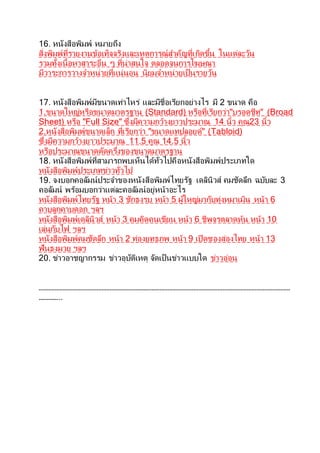16. หนังสือพิมพ์ หมายถึง สิ่งพิมพ์ที่รายงานข้อเท็จจริงและเหตุการณ์สาคัญที่เกิดขึ้น