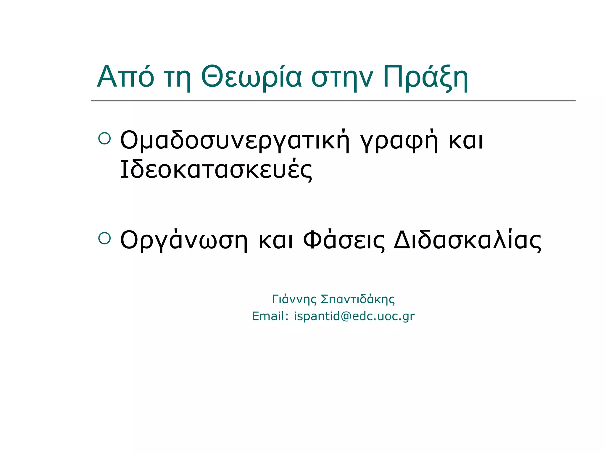 Από τη Θεωρίαστην Πράξη Ομαδοσυνεργατική γραφή και Ιδεοκατασκευές Οργάνωση και Φάσεις Διδασκαλίας Γιάννης Σπαντιδάκης Email: ispantid@edc.uoc.gr