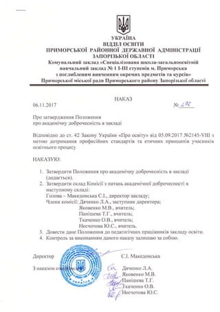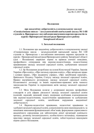 Положення про академічну доброчесність в комунальному закладі «Спеціалізована школа – загальноосвітній навчальний заклад №1 І-ІІІ ступенів м. Приморська з поглибленим вивченням окремих предметів та курсів» Приморської міської ради Приморського району