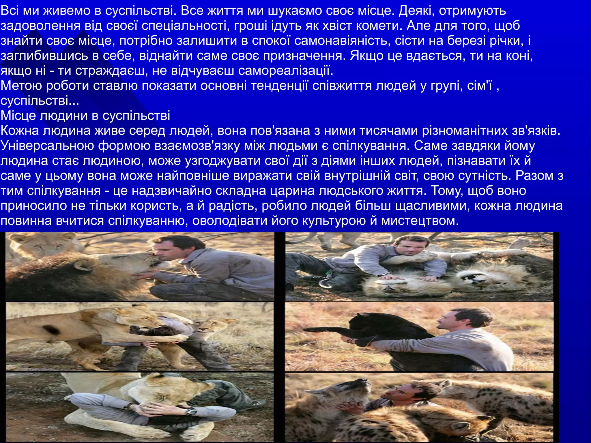 Й нарешті, кожна людина не може не усвідомлювати сьогодні своєї належності до найбільшої людської спільноти - людства. Бо у наш час, як ніколи раніше, людство стає єдиним. І сприяння зростанню цієї єдності, налагодженню дружніх відносин між усіма народами й людьми є найпершою запорукою успішного розв'язання тих величних проблем і завдань, що стоять перед людством загалом на порозі XXI сторіччя.
