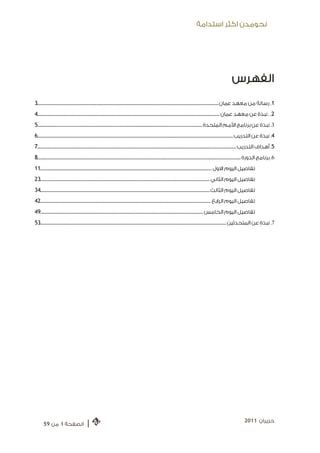 ﺍﻟﻔﻬﺮﺱ 1. ﺭﺳﺎﻟﺔ ﻣﻦ ﻣﻌﻬﺪ ﻋﻤﺎﻥ ...........................................................................................................................................................................................3 2. . ﻧﺒﺬﺓ ﻋﻦ ﻣﻌﻬﺪ ﻋﻤﺎﻥ ............................................................................................................................................................................................4 3. ﻧﺒﺬﺓ ﻋﻦ ﺑﺮﻧﺎﻣﺞ ﺍﻷﻣﻢ ﺍﻟﻤﺘﺤﺪﺓ ..........................................................................................................................................................................5 4. ﻧﺒﺬﺓ ﻋﻦ ﺍﻟﺘﺪﺭﻳﺐ ..........................................................................................................................................................................................................6 5. ﺃﻫﺪﺍﻑ ﺍﻟﺘﺪﺭﻳﺐ .............................................................................................................................................................................................................7 6. ﺑﺮﻧﺎﻣﺞ ﺍﻟﺪﻭﺭﺓ ..................................................................................................................................................................................................................8 ﺗﻔﺎﺻﻴﻞ ﺍﻟﻴﻮﻡ ﺍﻻﻭﻝ .................................................................................................................................................................................11 ﺗﻔﺎﺻﻴﻞ ﺍﻟﻴﻮﻡ ﺍﻟﺜﺎﻧﻲ ...............................................................................................................................................................................32 ﺗﻔﺎﺻﻴﻞ ﺍﻟﻴﻮﻡ ﺍﻟﺜﺎﻟﺚ ...............................................................................................................................................................................43 ﺗﻔﺎﺻﻴﻞ ﺍﻟﻴﻮﻡ ﺍﻟﺮﺍﺑﻊ ................................................................................................................................................................................24 ﺗﻔﺎﺻﻴﻞ ﺍﻟﻴﻮﻡ ﺍﻟﺨﺎﻣﺲ ........................................................................................................................................................................94 7. ﻧﺒﺬﺓ ﻋﻦ ﺍﻟﻤﺘﺤﺪﺛﻴﻦ ................................................................................................................................................................................................35 ﺣﺰﻳﺮﺍﻥ 1102 ﺍﻟﺼﻔﺤﺔ 1 ﻣﻦ 95 |