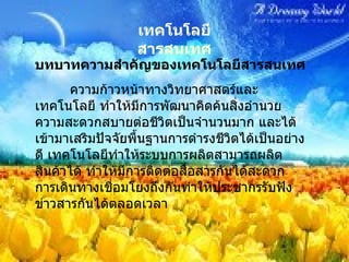 เทคโนโลยีสารสนเท 1. 2. 3. ในอดีตยุคมนุษย์เร่ร่อน มีอาชีพเกษตรกรรม ล่าสัตว์ ต่อมามีการรวมตัวกันสร้างเมือง และเกิดอุตสาหกรรมการผลิต แต่หลังจากปี พ . ศ . 2530 เป็นต้นมาระบบสื่อสารโทรคมนาคมและคอมพิวเตอร์ก้าวหน้ามาก ทำให้เกิดการเปลี่ยนแปลงเข้าสู่ยุคสังคมสารสนเทศ ทำให้ข่าวสารแพร่กระจายไปอย่างรวดเร็ว 4. นิยามเกี่ยวกับเทคโนโลยีสารสนเทศ คำว่า “เทคโนโลยี” หมายถึงการประยุกต์เอาความรู้ทางด้านวิทยาศาสตร์มาใช้ให้เกิดประโยชน์การศึกษาพัฒนาองค์ความรู้ต่าง ๆ เพื่อให้เข้าใจธรรมชาติ กฎเกณฑ์ของสิ่งต่างๆ และหาทางนำมาประยุกต์ให้เกิดประโยชน์ บางครั้งมีคนที่เรียนรู้การแยกสกัดเอาสารซิลิกอนให้บริสุทธิ์ และเจือบางอย่างให้เกิดสารกึ่งตัวนำ นำมาผลิตเป็นทรานซิสเตอร์และไอซี สารซิลิกอนดังกล่าวเมื่อนำมาผ่านกรรมวิธีและจะมีราคาสูงสามารถนำไปขายได้เงินเป็นจำนวนมาก 5. ส่วนคำว่า สารสนเทศ หมายถึง ข้อมูลที่เป็นประโยชน์ต่อการดำเนินชีวิต มนุษย์แต่ละคนเรียนรู้สภาพสังคมความเป็นอยู่ ลองจินตนาการดูว่าในสมองเราเก็บข้อมูลอะไรบางอย่าง เราคงตอบไม่ได้แต่สามารถเรียกเอาข้อมูลมาใช้ได้ ข้อมูลที่เก็บไว้ในสมองเป็นสิ่งที่สะสมกันมานาน ดังนั้นจะเห็นได้ชัดว่าความรู้เกิดจากข้อมูลข่าวสารต่างๆ ทุกวันนี้มีข้อมูลรอบตัวเรามาก ข้อมูลเหล่านี้มาจากสื่อ 6. เราจะได้พบกับสิ่งรอบ ๆ ที่เกี่ยวกับการใช้สารสนเทศอยู่มาก ดังนี้ - การเก็บรวบรวมข้อมูล เป็นวิธีการรวบรวมข้อมูลเข้าสู่ระบบ เพื่อให้เครื่องอ่านเก็บรวบรวมข้อมูลได้ - การประมวลผล ข้อมูลที่เก็บมาได้มักจะเก็บในสื่อต่าง ๆ เช่น แผ่นบันทึก แผ่นซีดี ข้อมูลเหล่านี้จะถูกนำมาประมวลผลตามต้องการ - การแสดงผลลัพธ์ อุปกรณ์ที่ใช้เทคโนโลยีการแสดงผลลัพธ์มีมาก สามารถแสดงเป็นตัวหนังสือ ตลอดจนพิมพ์ออกมาที่กระดาษ การแสดงผลลัพธ์มีทั้งเป็นภาพ เสียง หรือวีดิทัศน์ 7. - การทำสำเนา เมื่อมีข้อมูลมาเก็บในสื่ออิเล็กทรอนิกส์ต่างๆ การทำสำเนาจะทำได้ง่ายและได้จำนวนมาก ดังนั้นอุปกรณ์ช่วยในการทำสำเนา จัดได้ว่าเป็นเทคโนโลยีสารสนเทศที่มีการพัฒนาอย่างต่อเนื่อง - การสื่อสารโทรคมนาคม เป็นวิธีการที่จะส่งจากที่หนึ่งไปอีกที่หนึ่ง ปัจจุบันมีอุปกรณ์ระบบสื่อสารโทรคมนาคมมีหลายประเภท ตั้งแต่โทรเลข โทรศัพท์ เส้นใยนำแสง จนถึงดาวเทียมเป็นต้น 8. ลักษณะสำคัญของเทคโนโลยีสารสนเทศ มีดังนี้ - เทคโนโลยีสารสนเทศช่วยเพิ่มผลผลิต ลดต้นทุน และเพิ่มประสิทธิภาพในการทำงานในการประกอบการทางด้านเศรษฐกิจ การค้า และการอุตสาหกรรม - เทคโนโลยีส