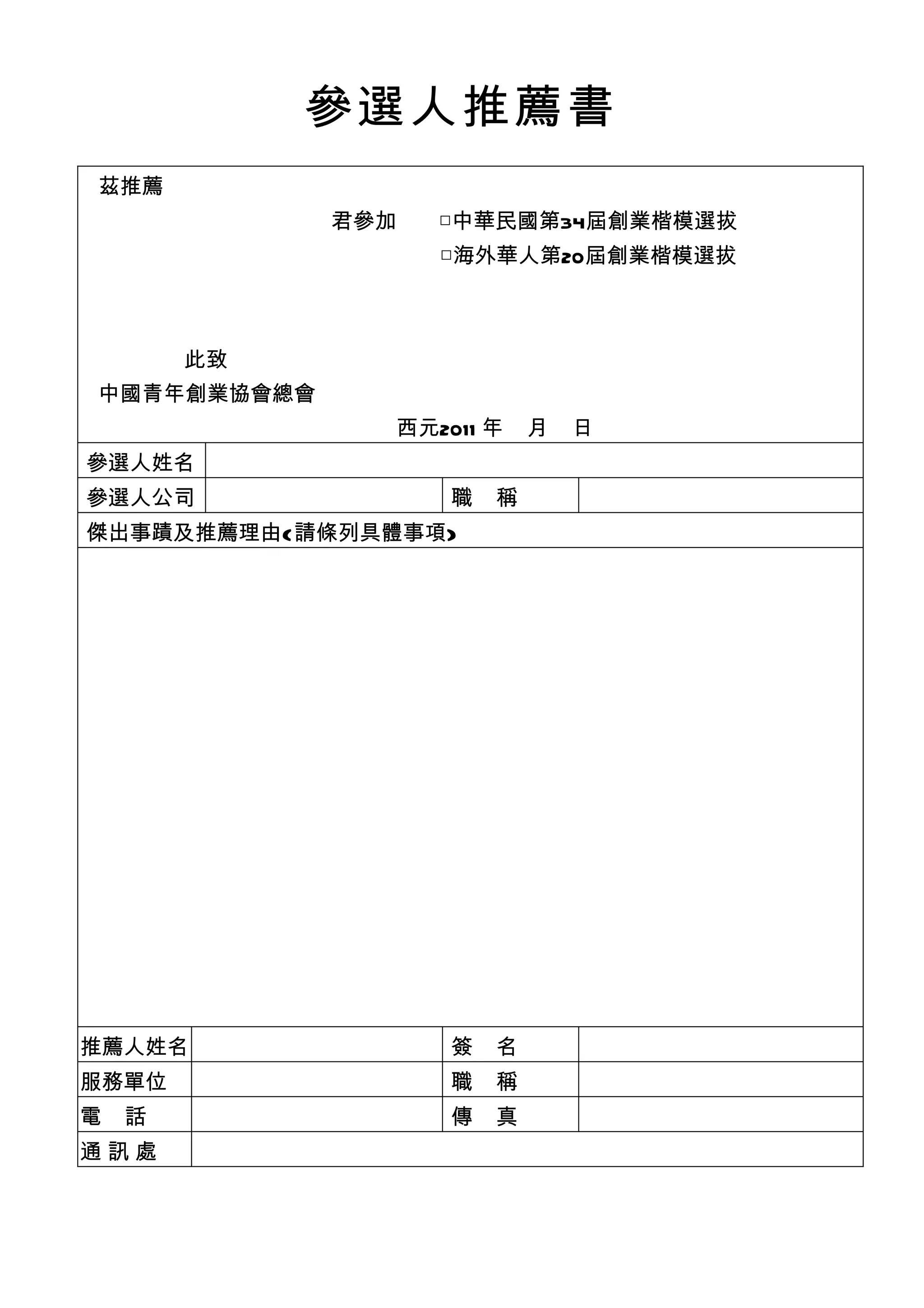 此文档是关于推荐参加创业楷模选拔的申请表,包含个人和公司信息表、创业经历、财务状况及申请人的相关背景。它要求推荐人提供详细的推荐理由及申请人过去的成就、公司运营状况及社会责任信息。文档结构清晰,适合用于创业者申请参与相关评选并展示其能力与贡献。