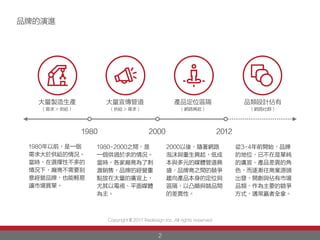 Redesign Inc. All rights reserved 1980 2000 2012 品牌的演進 1980年以前,是一個 需求大於供給的情況。 當時,在選擇性不多的 情況下,廠商不需要刻 意經營品牌,也能輕易 讓市場買單。 1980-2000之間,是 一個供過於求的情況。 當時,各家廠商為了刺 激銷售,品牌的經營重 點放在大量的廣宣上, 尤其以電視、平面媒體 為主。 2000以後,隨著網路 泡沫與重生興起,低成 本與多元的媒體管道興 盛,品牌商之間的競爭 趨向產品本身的定位與 區隔,以凸顯與競品間 的差異性。 從3-4年前開始,品牌 的地位,已不在是單純 的廣宣、產品差異的角 色,而逐漸往商業源頭 出發,開創與佔有市場 品類,作為主要的競爭 方式,通常贏者全拿。 2 大量製造生產 (需求 > 供給) 大量宣傳管道 (供給 > 需求) 產品定位區隔 (網路興起) 品類設計佔有 (網路社群)