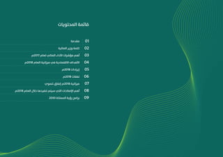 تستعرض الوثيقة ميزانية المملكة العربية السعودية لعام 8102م، حيث تسلط الضوء على الإيرادات والنفقات والأهداف الاقتصادية المرتبطة برؤية 2030. الميزانية تعكس جهود الحكومة في تنفيذ إصلاحات تنموية واجتماعية، وتتضمن معلومات عن العجز المتوقع والنمو الاقتصادي. تهدف الميزانية إلى تحسين مستوى المعيشة للمواطنين وتعزيز النمو الاقتصادي المستدام.