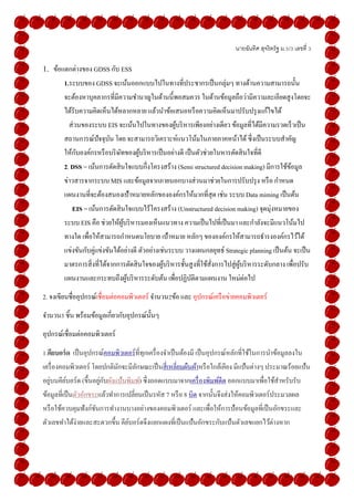 เลขที่ 3 1. ข้อแตกต่างของ GDSS กับ ESS 1.ระบบของ GDSS จะเน้นออกแบบไปในทางที่ประชากรเป็นกลุ่มๆ ทางด้านความสามารถนั้น จะต้องหาบุคลากรที่มีความชานาญในด้านนี้พอสมควร ในด้านข้อมูลถือว่ามีความละเอียดสูงโดยจะ ได้รับความคิดเห็นได้หลากหลาย แล้วนาข้อเสนอหรือความคิดเห็นมาปรับปรุงแก้ไขได้ ส่วนของระบบ EIS จะเน้นไปในทางของผู้บริหารเพียงอย่างเดียว ข้อมูลที่ได้มีความรวดเร็วเป็น สถานการณ์ปัจจุบัน โดย จะสามารถวิเคราะห์แนวโน้มในภายภาคหน้าได้ซึ่งเป็นระบบสาคัญ ให้กับองค์กรหรือบริษัทของผู้บริหารเป็นอย่างดี เป็นตัวช่วยในหารตัดสินใจที่ดี 2.DSS = เน้นการตัดสินใจแบบกึ่งโครงสร้าง (Semi structured decision making) มีการใช้ข้อมูล ข่าวสารจากระบบ MIS และข้อมูลจากภายนอกบางส่วนมาช่วยในการปรับปรุง หรือ กาหนด แผนงานที่จะต้องสนองเป้าหมายหลักขององค์กรให้มากที่สุด เช่น ระบบ Data miming เป็นต้น EIS = เน้นการตัดสินใจแบบไร้โครงสร้าง (Unstructured decision making) จุดมุ่งหมายของ ระบบ EIS คือ ช่วยให้ผู้บริหารมองเห็นแนวทาง ความเป็นไปที่เป็นมา และกาลังจะมีแนวโน้มไป ทางใด เพื่อให้สามารถกาหนดนโยบาย เป้าหมาย หลักๆ ขององค์กรให้สามารถธารงองค์กรไว้ได้ แข่งขันกับคู่แข่งขันได้อย่างดี ตัวอย่างเช่นระบบ วางแผนกลยุทธ์ Strategic planning เป็นต้น จะเป็น มาตรการสิ่งที่ได้จากการตัดสินใจของผู้บริหารชั้นสูงที่ใช้สั่งการไปสู่ผู้บริหารระดับกลาง เพื่อปรับ แผนงานและกระทบถึงผู้บริหารระดับต้น เพื่อปฏิบัติตามแผนงาน ใหม่ต่อไป 2. จงเขียนชื่ออุปกรณ์เชื่อมต่อคอมพิวเตอร์ จานวน2ข้อ และ อุปกรณ์เครือข่ายคอมพิวเตอร์ จานวน3 ชิ้น พร้อมข้อมูลเกี่ยวกับอุปกรณ์นั้นๆ อุปกรณ์เชื่อมต่อคอมพิวเตอร์ 1.คียบอร์ด เป็นอุปกรณ์คอมพิวเตอร์ที่ทุกเครื่องจาเป็นต้องมี เป็นอุปกรณ์หลักที่ใช้ในการนาข้อมูลลงใน เครื่องคอมพิวเตอร์ โดยปกติมักจะมีลักษณะเป็นสี่เหลี่ยมผืนผ้าหรือใกล้เคียง มีแป้นต่างๆ ประมาณร้อยแป้น อยู่บนคีย์บอร์ด (ขึ้นอยู่กับผังแป้นพิมพ์) ซึ่งถอดแบบมาจากเครื่องพิมพ์ดีด ออกแบบมาเพื่อใช้สาหรับรับ ข้อมูลที่เป็นตัวอักขระแล้วทาการเปลี่ยนเป็นรหัส 7 หรือ 8 บิต จากนั้นจึงส่งให้คอมพิวเตอร์ประมวลผล หรือใช้ควบคุมฟังก์ชันการทางานบางอย่างของคอมพิวเตอร์ และเพื่อให้การป้อนข้อมูลที่เป็นอักขระและ ตัวเลขทาได้ง่ายและสะดวกขึ้น คีย์บอร์ดจึงแยกแผงที่เป็นแป้นอักขระกับแป้นตัวเลขแยกไว้ต่างหาก