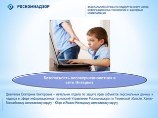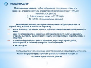 Документ обсуждает вопросы защиты персональных данных, особенно в контексте безопасности несовершеннолетних в интернете. Он подчеркивает, что всему населению необходимо осознавать риски, связанные с обменом личной информацией в сети, и предлагает стратегии для повышения правовой грамотности и защиты прав субъектов персональных данных. В конце документа приведены ресурсы и рекомендации по родительскому контролю для безопасного использования интернета детьми.