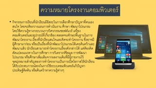 โครงงานจึงเป็น กิจกรรมการเรียนรู้ที่มีการเน้นผู้เรียนเป็นสาคัญ โดยผู้เรียนจะหาหัวข้อ โครงงานที่ตนเองสนใจ รวมทั้งเชื่อมโยงความรู้ต่าง ๆ และความรู้ด้าน คอมพิวเตอร์และเทคโนโลยีสารสนเทศ เพื่อสร้างผลงานตามความ ต้องการได้อย่างเหมาะสม โดยมีครูเป็นที่ปรึกษาและให้คาแนะนา ความสามารถที่เกิดจากการทาโครงงานคอมพิวเตอร์โครงงาน คอมพิวเตอร์เป็นกิจกรรมการเรียนรู้ที่ทาให้ผู้เรียนเกิดความสามารถใน ด้านต่าง ๆ ที่สาคัญ 5 ประการดังนี้ ความสาคัญของโครงงานคอมพิวเตอร์