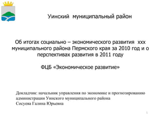 Доклад описывает итоги социально-экономического развития Уинского муниципального района Пермского края за 2010 год и перспективы на 2011 год. Основное внимание уделено развитию малого и среднего предпринимательства, сельского хозяйства, а также усилиям по развитию туризма и социальной инфраструктуры района. В документе представлены статистические данные о предприятиях, численности работающих и сельскохозяйственном производстве, а также о проведенных и запланированных мероприятиях.