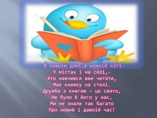 В кожнімдомі,вкожнійхаті-У містахіна селі,-Хтонавчивсявжечитати,Має книжку на столі.Дружба з книгою – це свято,Не було б його у нас,Ми не знали так багатоПро новийідавній час!