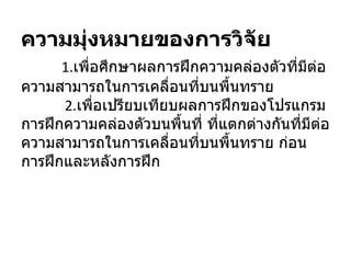 งานวิจัย 1. 2. ความมุ่งหมายของการวิจัย 1. เพื่อศึกษาผลการฝึกความคล่องตัวที่มีต่อความสามารถในการเคลื่อนที่บนพื้นทราย 2. เพื่อเปรียบเทียบผลการฝึกของโปรแกรมการฝึกความคล่องตัวบนพื้นที่ ที่แตกต่างกันที่มีต่อความสามารถในการเคลื่อนที่บนพื้นทราย ก่อนการฝึกและหลังการฝึก 3. 4. กลุ่มตัวอย่างที่ใช้ในการวิจัย กลุ่มตัวอย่างที่ใช้ในการวิจัยครั้งนี้เป็นนิสิตคณะพลศึกษาชั้นปีที่ 1 เพศชายของ มหาวิทยาลัยศรีนครินทรวิโรฒ องครักษ์ จำนวน 45 คน ที่ได้มาจากการสุ่มแบบเจาะจง เฉพาะนิสิตเพศชายที่อาสามาเข้ารับการฝึกและทดสอบ และแบ่งกลุ่มตัวอย่างออกเป็น 3 กลุ่ม กลุ่มละ 15 คน กำหนดดังนี้ กลุ่มที่ 1 การฝึกบนพื้นทราย กลุ่มที่ 2 การฝึกบนพื้นสนามหญ้า และกลุ่มที่ 3 การฝึกทั้งพื้นทรายและพื้นสนามหญ้า 5. นิยามศัพท์ ความคล่องตัว หมายถึง ความสามรถของร่างกาย หรือส่วนของร่างกายในการเคลื่อนไหวไปได้อย่างรวดเร็วและมีทิศทางแน่นอนโดยไม่เสียการทรงตัว ความสามารถในการเคลื่อนที่บนพื้นทราย หมายถึง การใช้ทักษะความคล่องตัวในการเคลื่อนที่บนพื้นทรายหลังจากที่ได้รับการฝึกตามโปรแกรมการฝึกความคล่องตัว 3 ลักษณะ มาใช้ในการทดสอบความสามารถในการเคลื่อนที่ไปบนพื้นทรายโดยใช้แบบทดสอบวิ่งเก็บของ ระยะ 10 เมตร บนพื้นที่ราบที่ปูด้วยทรายมีความหนาที่เหมาะสม กว้าง 4 เมตร ยาว 10 เมตร เพื่อจับเวลาเป็นวินาที และเปรียบเทียบกันทั้งกลุ่มที่ 1 กลุ่มที่ 2 และกลุ่มที่ 3 6. โปรแกรมการฝึกความคล่องตัว 3 ลักษณะ หมายถึง โปรแกรมการฝึกที่ผู้วิจัยได้สร้างขึ้นเพื่อใช้ในการฝึกความสามรถทางกลไกด้านความคล่องตัวให้กับนิสิตที่เป็นอาสาเป็นกลุ่มตัวอย่างเป็นเวลา 3 วันต่อสัปดาห์ คือ จันทร์ พุธ และ ศุกร์ วันละ 1 ชั่วโมงครึ่ง ถึง 2 ชั่วโมงขึ้นระยะเวลาในการฝึกทั้งสิ้น 8 สัปดาห์ โดยการจำแนกกลุ่มการฝึกออกเป็น 3 สถานที่ ได้แก่ 3.1 กลุ่มที่ 1 การฝึกบนพื้นทราย 3.2 กลุ่มที่ 2 การฝึกบนพื้นสนามหญ้า 3.3 กลุ่มที่ 3 การฝึกบนพื้นทรายและพื้นสนามหญ้า แบบทดสอบความคล่องตัวความสามารถในการเคลื่อนที่บนพื้นทราย หมายถึง แบบทดสอบที่ใช้วัดความสามารถในการเคลื่อนที่บนพื้นทรายโดยใช้ทักษะความคล่องตัวด้วยความเร็วสูงสุดในการวิ่งเก็บของบนพื้นทราย โดยดัดแปลงจากแบบทดสอบมาตรฐานการวิ่งเก็บของบนพื้นเรียบ ระยะทาง 10 เมตร (10 Meter Shuttle Run ) ของคณะกรรมการระหว่างประเทศว่าด้วยการกำหนดมาตรฐานแบบทดสอบสมรรถภาพทางกาย ( I.C.S.P.F.T ) เป็นลักษณะการวิ่งเก็บของไปและกลับจำนวน 2 เที่ยว 7. 8. การสร้างเครื่องมือที่ใช้ในการวิจัย 1. โปรแกรมการฝึกความคล่องตัวบนพื้นท