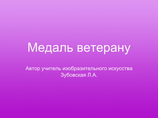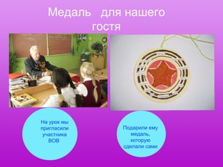 Документ описывает процесс создания медали для ветерана, приглашенного на урок учителя изобразительного искусства. Медаль включает в себя круглый дизайн и элементы, такие как красный круг и звёздочка, украшенная цветным песком. Основные этапы работы заключаются в вырезании и наклеивании различных частей медали.