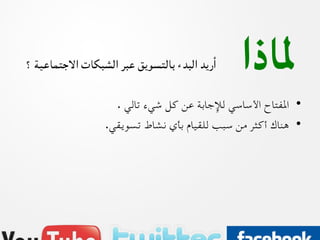 يتناول الوثيقة خمس أسئلة يجب طرحها قبل بدء التسويق عبر الشبكات الاجتماعية، مشيرة إلى أهمية معرفة المنتج والمعلومات الأساسية. كما يركز على توضيح المسؤوليات في إدارة الحضور الرقمي واختيار القنوات المناسبة للتواصل. أخيراً، يناقش كيفية قياس نجاح التواجد الإلكتروني من خلال الفوائد المختلفة.