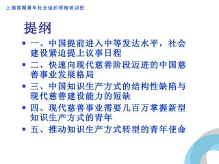 该文档探讨了中国在经济快速发展中,提前进入中等发达水平的背景,以及社会建设和现代慈善事业面临的挑战与机遇。它强调了年轻人应该承担推动知识生产方式转型的使命,并指出现代慈善的快速发展与社会服务的重要性。文中提到的例证,展示了中国在慈善组织、志愿者参与和社会福利方面的明显进步。