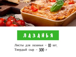 Документ содержит рецепт лазаньи с соусом 'болоньезе' и 'бешамель', включая список необходимых ингредиентов и подробные этапы приготовления. Также приведены стоимость ингредиентов и перечень используемых инструментов и оборудования. Общая стоимость приготовления лазаньи составляет 44,93 рублей.
