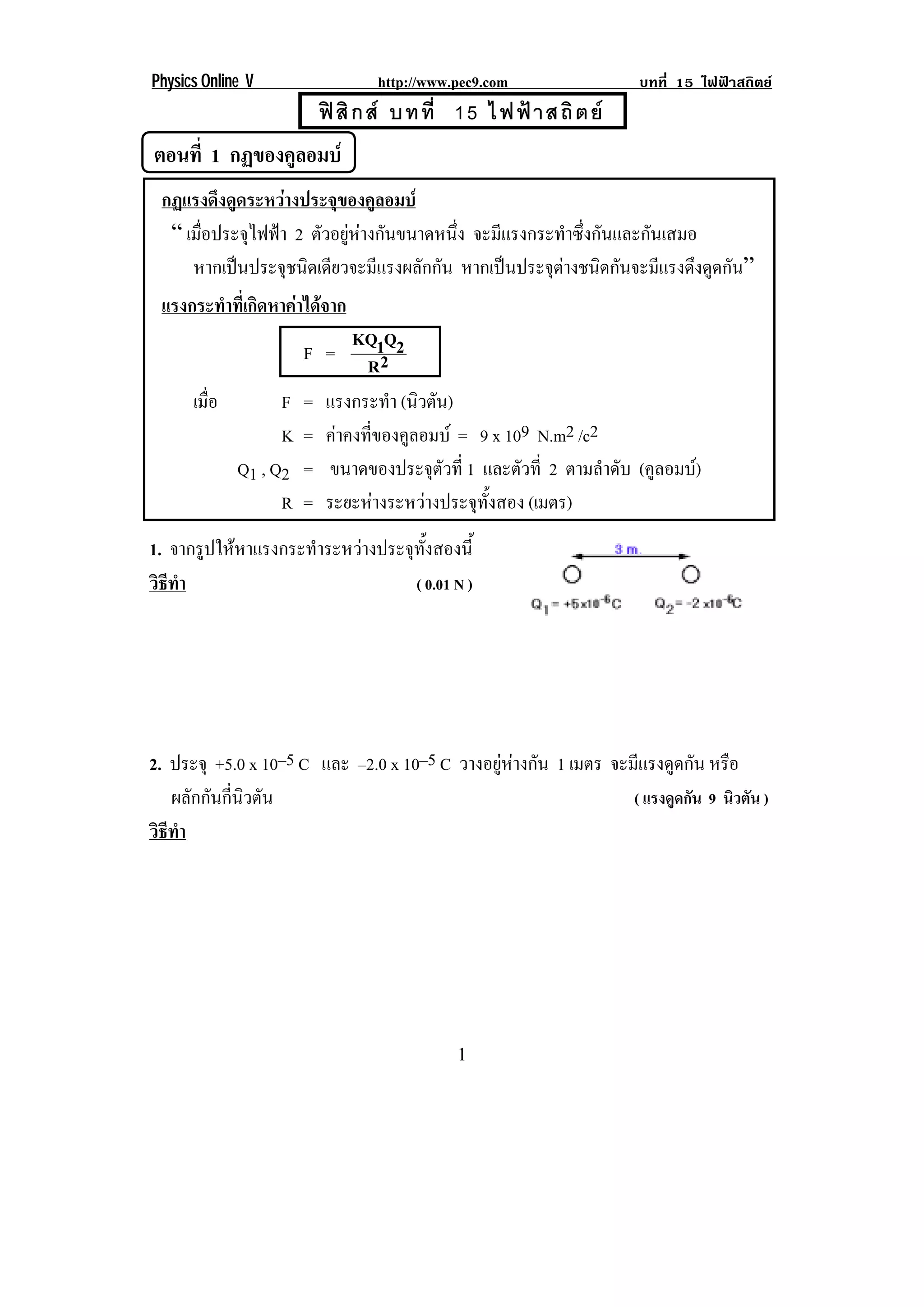 Physics Online V http://www.pec9.com บทที่ 15 ไฟฟาสถิตย