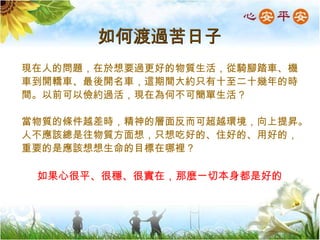 如何渡過苦日子 如果心很平、很穩、很實在,那麼一切本身都是好的 現在人的問題,在於想要過更好的物質生活,從騎腳踏車、機車到開轎車、最後開名車,這期間大約只有十至二十幾年的時間。以前可以儉約過活,現在為何不可簡單生活?