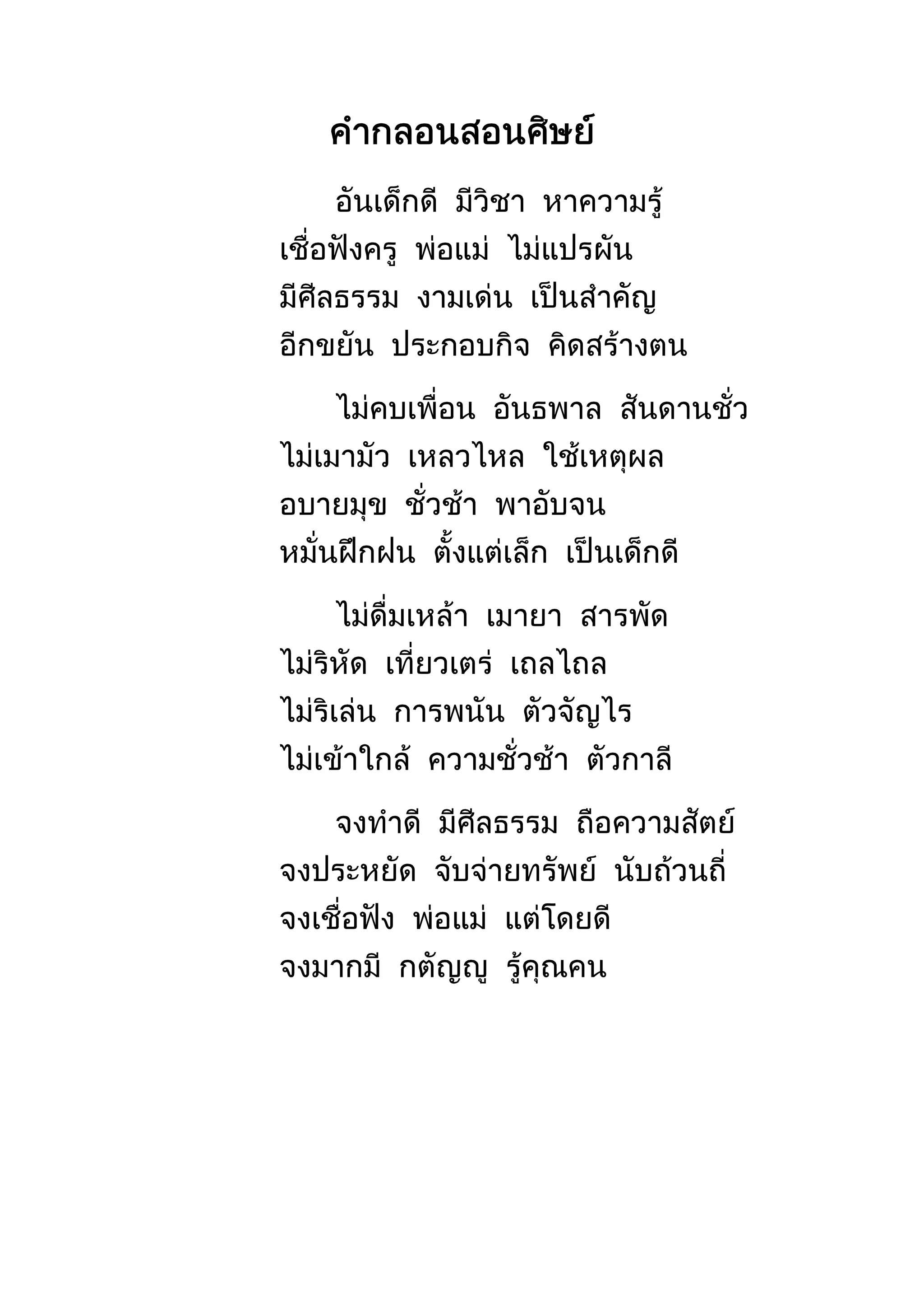 คำกลอนสอนศิษย์<br />อันเด็กดี มีวิชา หาความรู้เชื่อฟังครู พ่อแม่ ไม่แปรผันมีศีลธรรม งามเด่น เป็นสำคัญอีกขยัน ประกอบกิจ คิดสร้างตน<br />ไม่คบเพื่อน อันธพาล สันดานชั่วไม่เมามัว เหลวไหล ใช้เหตุผลอบายมุข ชั่วช้า พาอับจนหมั่นฝึกฝน ตั้งแต่เล็ก เป็นเด็กดี<br />ไม่ดื่มเหล้า เมายา สารพัดไม่ริหัด เที่ยวเตร่ เถลไถลไม่ริเล่น การพนัน ตัวจัญไรไม่เข้าใกล้ ความชั่วช้า ตัวกาลี<br />จงทำดี มีศีลธรรม ถือความสัตย์จงประหยัด จับจ่ายทรัพย์ นับถ้วนถี่จงเชื่อฟัง พ่อแม่ แต่โดยดีจงมากมี กตัญญู รู้คุณคน<br />