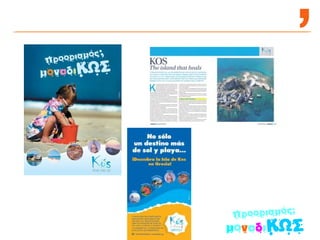 Οι δράσεις προβολήςκαι προώθησης της Κω Νέο λογότυπο Νέα φωτογράφιση Αεροκινηματογραφηση Νέα κινηματογράφηση Σύνθεση slogan: «Προορισμός ΜοναδιΚΩΣ» Δημιουργία ανταγωνιστικού προωθητικού υλικού Έντυπο για την Κω, 100.000 αντίτυπα, σε 11 γλώσσες Ειδικό φυλλάδιο – πρόγραμμα για ημερήσιες επισκέψεις, 80.000 αντίτυπα, σε 12 γλώσσες Τουριστικό ντοκιμαντέρ 10.000 DVD με ποιοτικά χαρακτηριστικά του νησιού και τις δραστηριότητες που προσφέρονται Παραγωγή και διανομή διαφημιστικών δώρων Ανανέωση της εικόνας με: