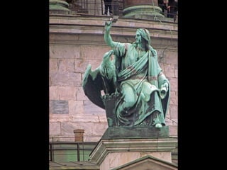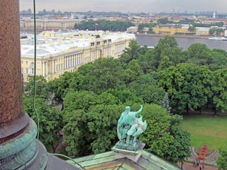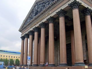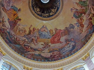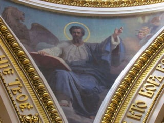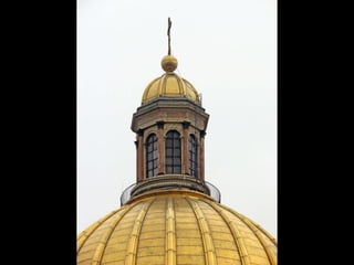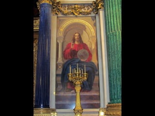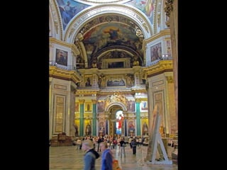 Документ описывает Исаакиевский собор в Санкт-Петербурге, включая его конструкцию, архитекторов и детали интерьеров. Упоминается использование витражей в храме, для которых требуется разрешение синода, а также планы по замене икон на мозаику, которые были выполнены лишь частично. Документ также упоминает виды на город с колоннады и службы в соборе.