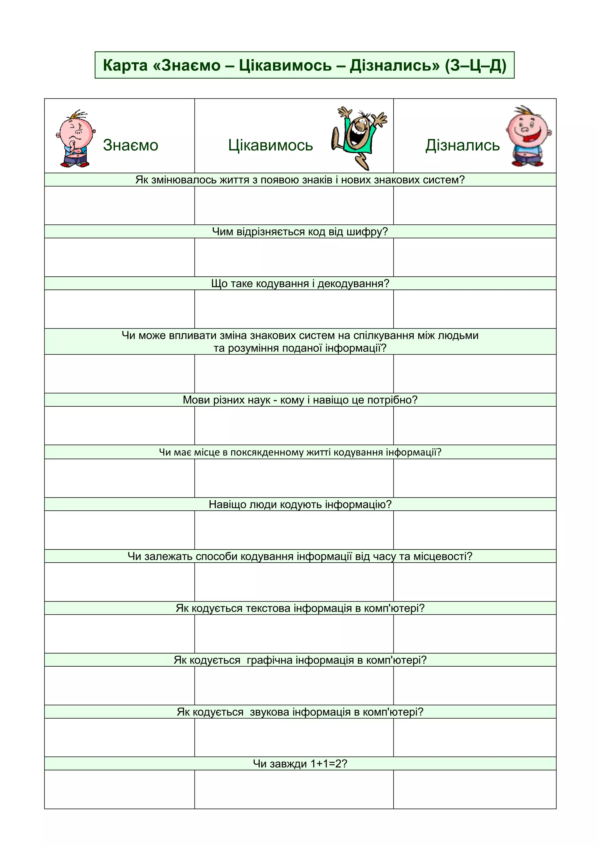 Карта «Знаємо –Цікавимось – Дізнались» (З–Ц–Д)<br /> ЗнаємоЦікавимось ДізналисьЯк змінювалось життя з появою знаків і нових знакових систем?Чим відрізняється код від шифру?Що таке кодування і декодування?Чи може впливати зміна знакових систем на спілкування між людьми та розуміння поданої інформації?Мови різних наук - кому і навіщо це потрібно?Чи має місце в поксякденному житті кодування інформації?Навіщо люди кодують інформацію?Чи залежать способи кодування інформації від часу та місцевості?Як кодується текстова інформація в комп'ютері?Як кодується графічна інформація в комп'ютері?Як кодується звукова інформація в комп'ютері?Чи завжди 1+1=2?<br />