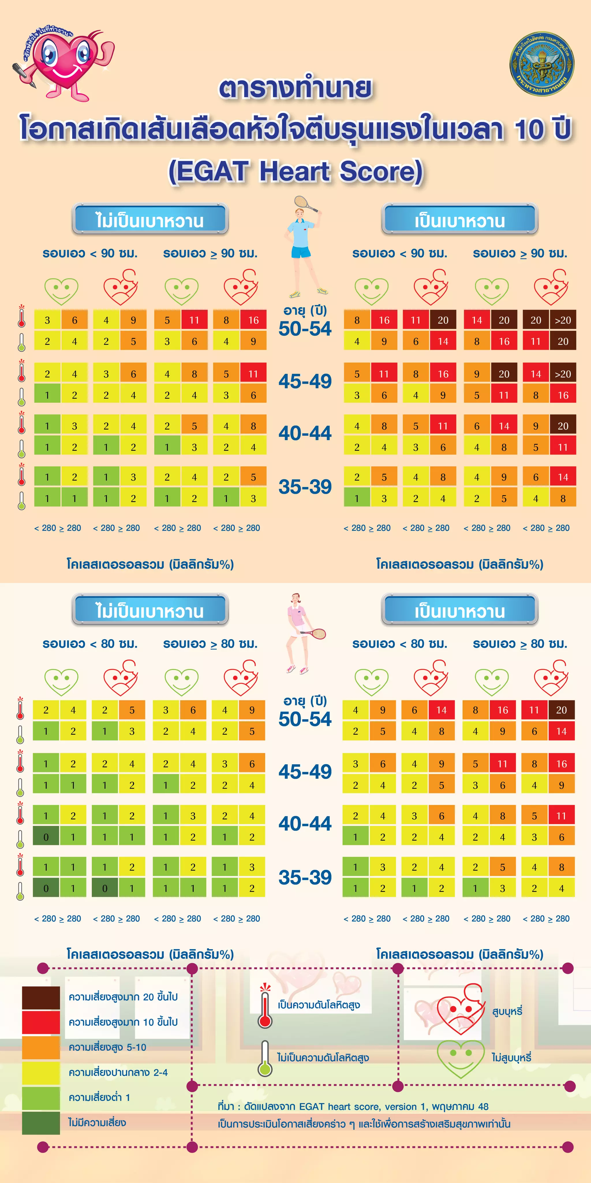 ตารางทำนายโอกาสเกิดเส้นเลือดหัวใจตีบรุณแรงในเวลา 10 ปี ( EGAT Heart Score ) ดูข้อมูลจากการเป็นโรคเบาหวาน , รอบเอว, การเป็นโรคความดันโลหิตสูง ,ระดับคอเลสเตอรอล การสูบบุหรี่ อายุ เพศ แปลผลเป็นความเสี่ยง 6 ระดับ โดยเป็นการประเมินคร่าว และใช้เป็นแนวทางการสร้างเสริมสุขภาพเท่านั้นครับ