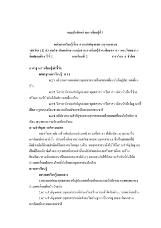 3 หน่ วยการเรียนรู้ เรื่อง ความสาคัญของพระพุทธศาสนา รหัสวิชา ส22103 รายวิชา สั งคมศึกษา 4 กลุ่มสาระการเรียนรู้ สังคมศึกษา ศาสนา และวัฒนธรรม ชั้นมัธยมศึกษาปี ที่ 2 ภาคเรียนที่ 2 เวลาเรียน 6 ชั่วโมง มาตรฐานการเรียนรู้ /ตัวชี้วด ั มาตรฐานการเรียนรู้ ส 1.1 ม.2/1 อธิ บายการเผยแผ่พระพุทธศาสนาหรื อศาสนาที่ตนนับถือสู่ ประเทศเพื่อน บ้าน ม.2/2 วิเคราะห์ความสาคัญของพระพุทธศาสนาหรื อศาสนาที่ตนนับถือ ที่ช่วย ั สร้างความเข้าใจอันดีกบประเทศเพื่อนบ้าน ม.2/3 วิเคราะห์ความสาคัญของพระพุทธศาสนาหรื อศาสนาที่ตนนับถือในฐานะที่ เป็ นรากฐานของวัฒนธรรม เอกลักษณ์ของชาติและมรดกของชาติ ม.2/4 อภิปรายความสาคัญของพระพุทธศาสนาหรื อศาสนาที่ตนนับถือกับการ พัฒนาชุมชนและการจัดระเบียบสังคม สาระสาคัญ/ความคิดรวบยอด การสร้างสรรค์งานด้านศิลปะและประเพณี ความเชื่อต่าง ๆ ที่เป็ นวัฒนธรรมและเป็ น เอกลักษณ์ของชาติน้ น ส่ วนหนึ่งเกิดจากความศรัทธาทางพระพุทธศาสนา ซึ่ งเป็ นศาสนาที่มี ั อิทธิ พลต่อวิถีการดาเนินชีวตของคนไทยทุก ๆ ด้าน พรพุทธศาสนาจึงไม่ได้มีความสาคัญในฐานะ ิ เป็ นที่ยดเหนี่ยวจิตใจของพุทธศาสนิกชนเท่านั้นแต่ยงส่ งผลต่อการสร้างสรรค์ผลงานด้าน ึ ั ศิลปวัฒนธรรมที่ตกทอดมาเป็ นมรดกของชาติต่าง ๆ ตลอดจนก่อให้เกิดความสัมพันธ์อนดีกบ ั ั ประเทศเพื่อนบ้านของไทยที่นบถือพระพุทธศาสนาอีกด้วย ั สาระการเรียนรู้ สาระการเรียนรู้ แกนกลาง 1.การเผยแผ่พระพุทธศาสนาเข้าสู่ ประเทศเพื่อนบ้านและการนับถือพระพุทธศาสนาของ ประเทศเพื่อนบ้านในปัจจุบน ั 2.ความสาคัญของพระพุทธศาสนาที่ช่วยเสริ มสร้างความเข้าใจอันดีกบประเทศเพื่อนบ้าน ั 3.ความสาคัญของพระพุทธศาสนาต่อสังคมไทยในฐานะเป็ นรากฐานของวัฒนธรรม เอกลักษณ์และมรดกของชาติ